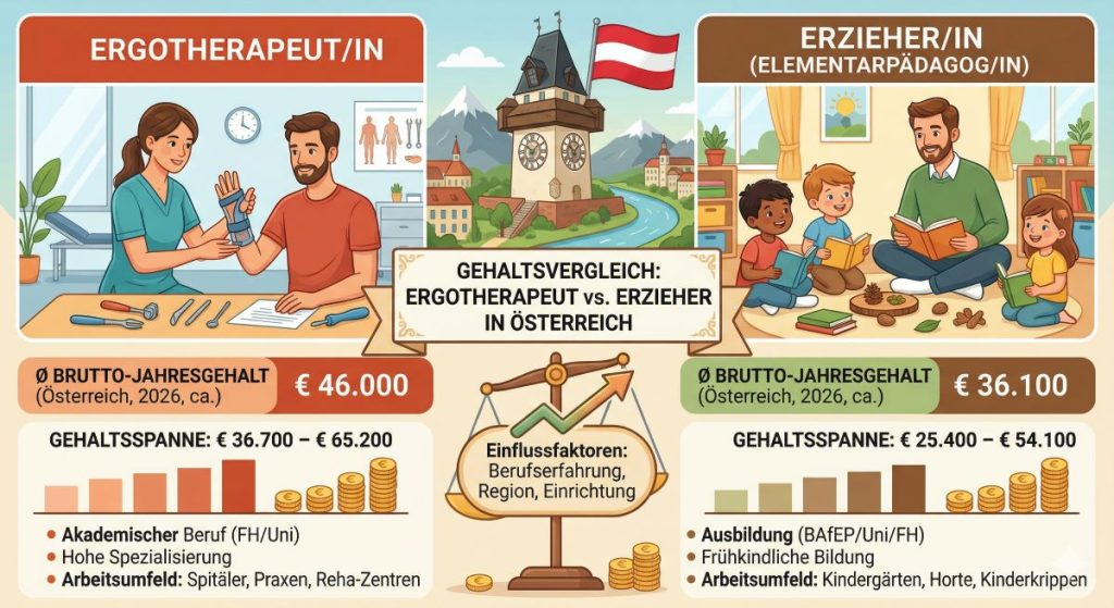 Wer die Frage auf Wien herunterbricht, bekommt eine ziemlich klare Tendenz: Ergotherapeut:innen verdienen beim Einstieg oft etwas mehr als klassische Elementarpädagog:innen. Wer jedoch im pädagogischen Bereich in öffentliche, spezialisierte oder inklusive Rollen kommt, kann finanziell sehr gut mithalten. Noch stärker wird das, wenn mit „Erzieher“ eigentlich Sozialpädagogik gemeint ist.